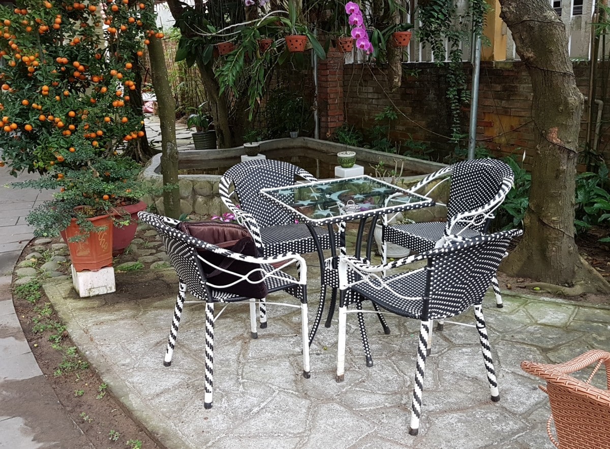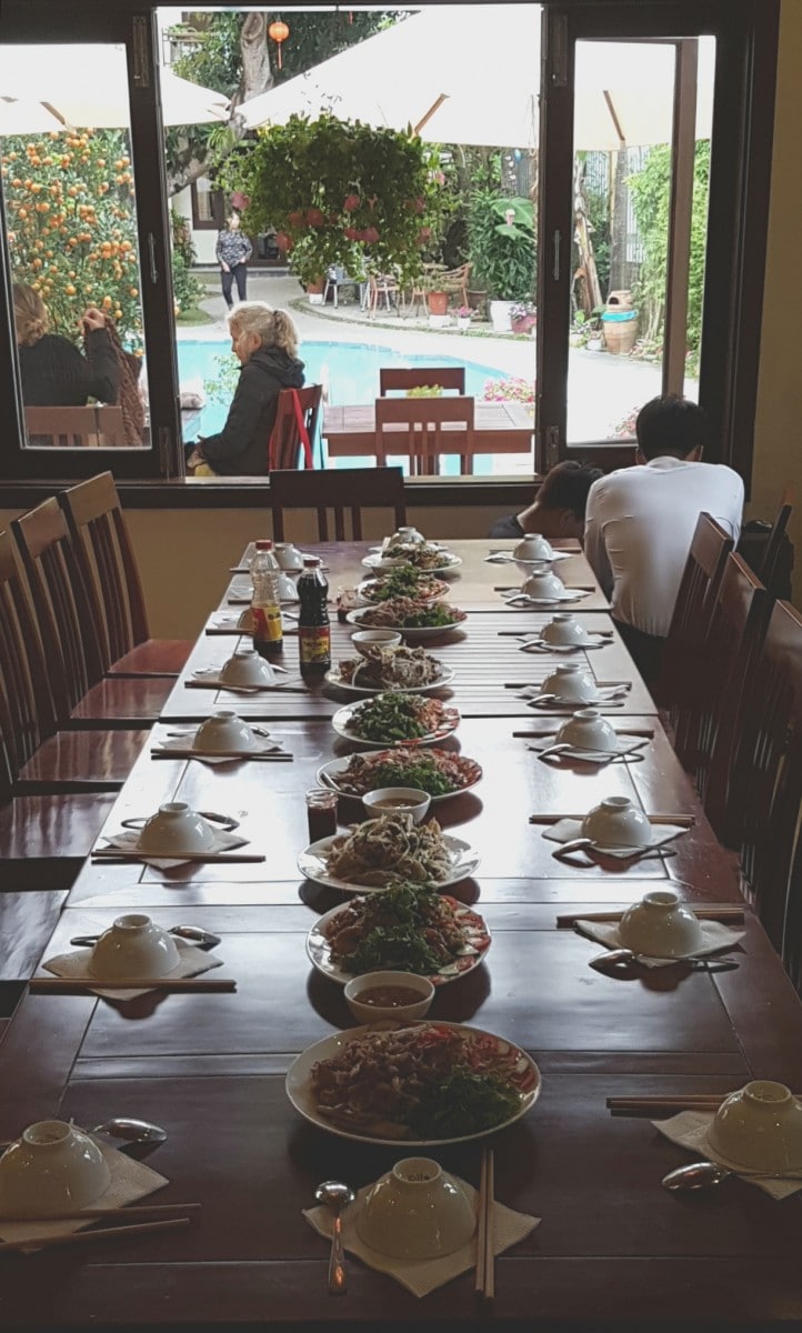 Halverwege de terugweg wordt ik geconfisqueerd door een fiets-riksja, die mij voor een veel te hoog bedrag (twee keer zoveel als de taxi, ontdek ik later) naar het hotel rijdt. Maar het is een sensatie om in zo’n rijdende stoel-met-luifel voorop te zitten met zo’n zwoegende fietser achter je. Wat me opvalt is dat hier geen terrasjes zijn. Wel zijn er hier en daar koffietentjes en er zitten groepjes mensen op lage stoeltjes aan lage tafeltjes voor hun huis of winkeltje. Thuis maak ik een praatje met de andere receptioniste, Ngoc. Dan doe ik een dutje en ga tegen half acht een hapje eten in het restaurant op de 2e verdieping, waar ik maar zelden mensen zie. De jongens, Lek Tiep en Thang, maken deze keer een lekkere kipschotel voor mij klaar: ik wil weer eens wat vlees proeven…